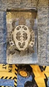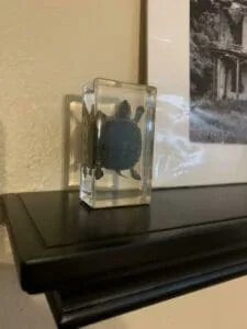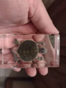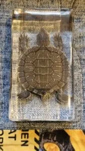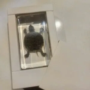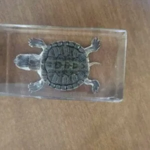 This real turtle in resin is a welcome addition to any teaching and scientific collection. The crystal clear resin make every detail viewable from all angles. Lucite block measures approx. 1 5/8 wide by 1 3/4 tall.
