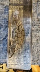 Buyer beware! Nothing wrong with the turtle, just soo small can't really see it. I actually keep a magnifying glass next to it and the others ones I purchased. Been wanting to return it just so busy haven't gotten around to it. Bottom line, great gift to a young child interested in creatures. I didn't think this through on this purchase. My mistake.