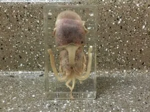 This is the Hummingbird Bobtail Squid, also known as Berry’s Bobtail Squid. This fascinating little specimen in resin offers an intriguing look at squid anatomy. Squid possess two long tentacles and eight arms—the tentacles are used to capture prey, while the arms secure it and guide it toward the central beak. The beak then cuts the food into smaller, digestible pieces. Squid are agile swimmers, relying on jet propulsion to move swiftly, and they primarily hunt using their keen eyesight. A remarkable addition to any collection or an excellent educational tool.