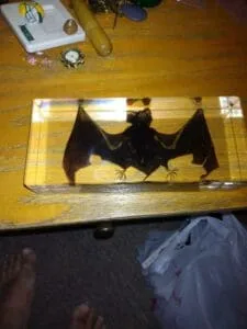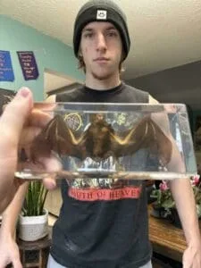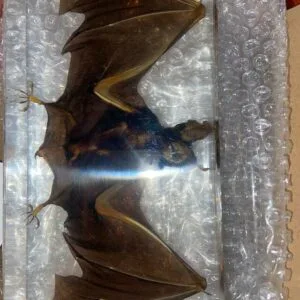 This stunning specimen in resin is the Pipistrelle Bat. This bat can be found all over the world. Ranging from Asia, North Africa, India and the British isles. Identifying marks is that it has a very short muzzle, typically reddish brown fur, and a wing span of about 7 – 9 3/4 inches.