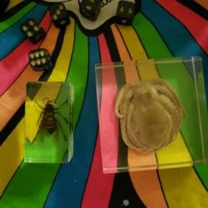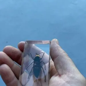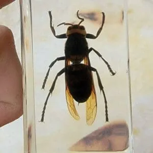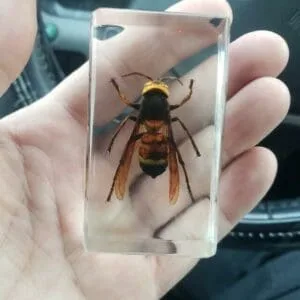 This is an excellent addition to any collection and wonderful conversation piece. Murder Hornets are omnivores and can grow up to two inches in length. You can safely inspect every detail, including it’s huge stinger, up close through the clear resin.