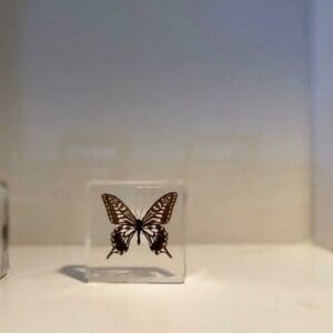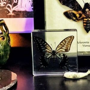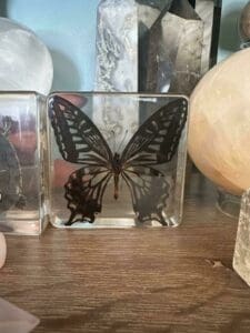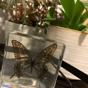 This black and white (pale yellow) butterfly makes for a lovely gift, or a pretty piece to add to your home decor. The fact that is is set in a solid block of lucite makes it also good as a scientific specimen for your entomology collection.
