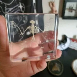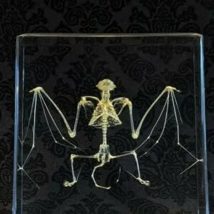 This bat skeleton in resin has been meticulously cleaned and whitened, allowing even the smallest of bones to be inspected and studied. It is encased in flawless resin allowing it to be viewed and from all angles. The nearly indestructible lucite makes it a wonderful teaching aid for years to come.