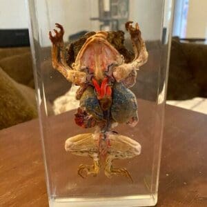 This dissected frog in resin makes for an excellent teaching aid. The specimen been has been meticulously dissected and it’s internal organs plasticized. The vivid red arteries and blue veins make it easy to learn the anatomy of a toad. It is set flawlessly in crystal clear resin making it a wonderful teaching tool that can be used for years and years.