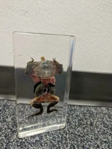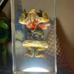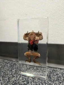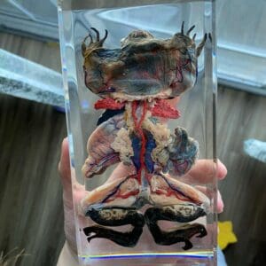 This dissected frog in resin makes for an excellent teaching aid. The specimen been has been meticulously dissected and it’s internal organs plasticized. The vivid red arteries and blue veins make it easy to learn the anatomy of a toad. It is set flawlessly in crystal clear resin making it a wonderful teaching tool that can be used for years and years.