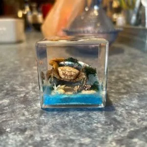 This real crab in resin is meticulously placed and positioned within a tiny faux habitat. It seems to be crawling over rocks and picking at tiny pieces of algae, an entire little world within a small solid cube. This Fiddler Crab diorama display makes for a great one-of-a-kind gift. It’s absolutely perfect for a desktop or unique addition to any ocean decor.