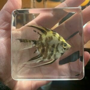 This real fish in resin is (Pterophyllum Scalare) a freshwater Angelfish. It is the most common species of Pterophyllum that is kept in captivity. It is originally native to the waters of the Amazon Basin in Brazil, Columbia and Peru.