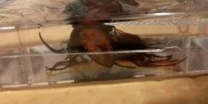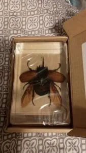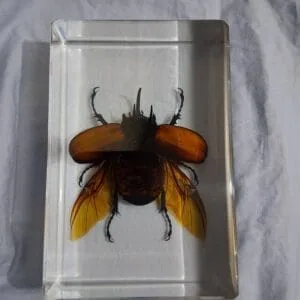This insanely impressive piece is a Giant Rhinoceros Beetles In Resin. Native to China, the scientific name is Eupatorus sukkiti. They are noticeable not only by there very large size but the three horns on their head.
