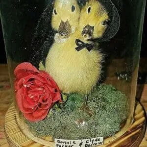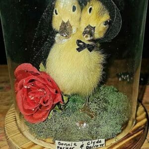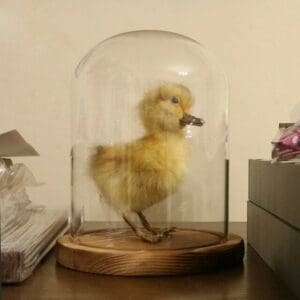 Large Dome option has a total height of approximately 7 inches tall by 5 ¾ inches in diameter. The glass cloche measures approximately 6 ½ inches tall with a 4 ½ inch in diameter. The large dome is especially recommended for showcasing our famous taxidermy ducklings found here:  Taxidermy Ducklings
