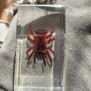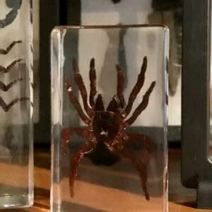 Like all spiders in resin, the size positioning and coloration can vary slightly. We guarantee a quality specimen. Lucite block measures approx. 2 3/4 inches by 1 1/2 inches.