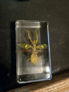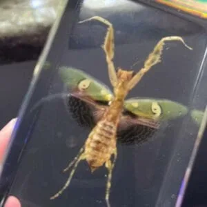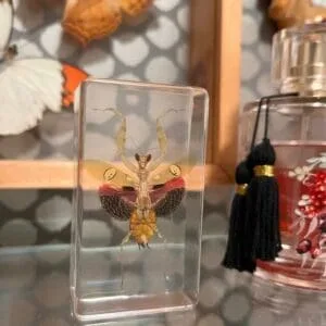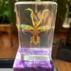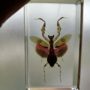 Growing to about two inches in length, this stunningly beautiful mantis in resin (Creobroter gemmatus) can be found living in humid regions. They are widespread in Asia. Females can be cannibalistic, although not common, it is more likely with this particular species of mantis.