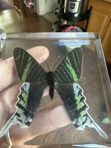To preserve its natural beauty, this specimen’s wings were carefully removed, protected, and then reassembled before being set in resin. In certain lighting, subtle signs of this preservation may be visible. As with all natural specimens in resin, size, coloring, and positioning of moth within the lucite can vary. We guarantee you will receive a quality specimen but not the exact one in photos.