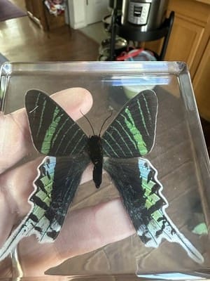 More Photos Coming Soon! This Large Green-Banded Urania Moth is beautifully preserved in crystal-clear resin, showcasing its vibrant, iridescent green bands and striking black wings. Native to tropical regions, this rare day-flying moth is admired for its dazzling coloration and graceful form. A stunning and unique piece, perfect for any oddities décor or curio cabinet.