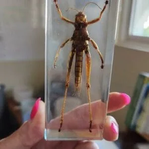 All locusts are grasshoppers, but not all grasshoppers are locusts. This real locust in resin is Chondracris rosea in the family Cyrtacanthacridinae. It has record distribution and can be found in India, Malaysia, and China.