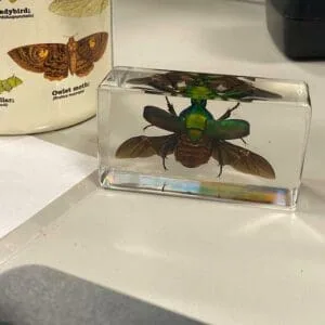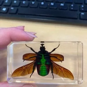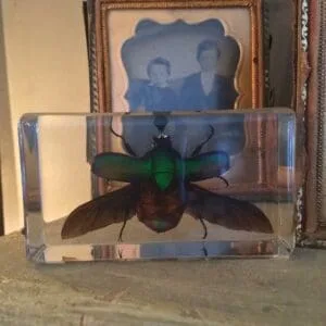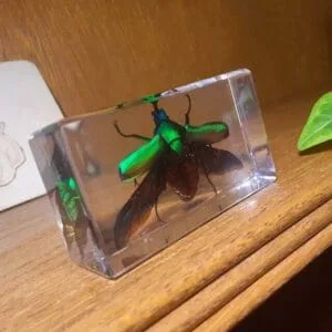 With it’s wings gently spread as if in flight, this beetle in resin, shimmers and shines. The dark greens and blues are quite impressive. It is viewable from all sides making this an excellent teaching aid or the perfect addition to any beetle collection.