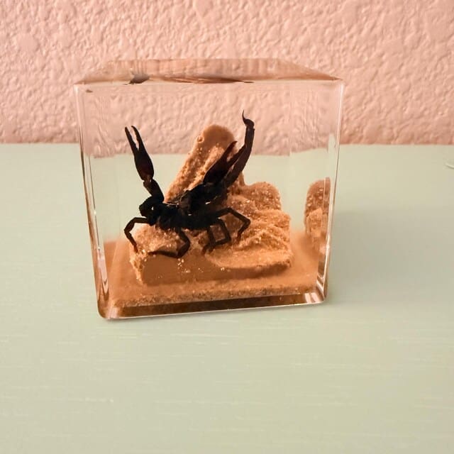 This real scorpion in resin is meticulously placed and positioned within a tiny faux habitat. In a defensive pose, hidden amongst the sand dunes, an entire little world within a small solid cube. This black scorpion diorama display makes for a great unique gift. It’s absolutely perfect for a desktop or unique addition to any insect collection.