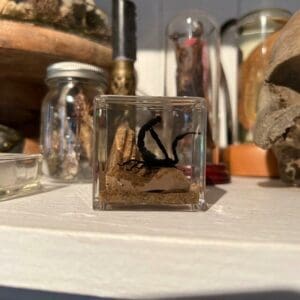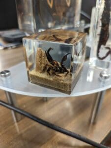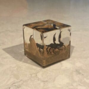 This real scorpion in resin is meticulously placed and positioned within a tiny faux habitat. In a defensive pose, hidden amongst the sand dunes, an entire little world within a small solid cube. This black scorpion diorama display makes for a great unique gift. It’s absolutely perfect for a desktop or unique addition to any insect collection.