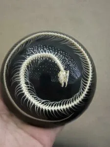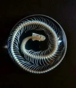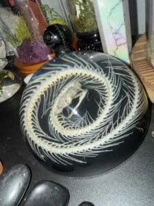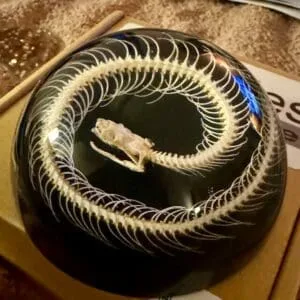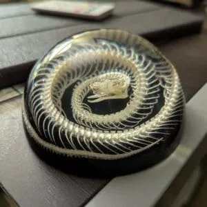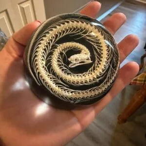 This snake skeleton in resin has been meticulously cleaned and whitened, allowing even the smallest of bones to be easily viewed and studied. It is encased in a resin dome with a black background which make for a stunning display. This piece is defiantly an eye-catcher and a perfect addition to any curio cabinet or oddities decor. The extremely durable resin will last for many years to come.