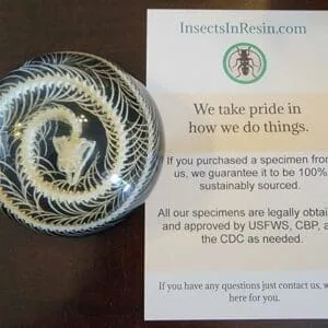 As with all skeleton specimens in resin, size, coloring, and positioning can vary. We guarantee you will receive a quality specimen. Resin dome measures approx. 3 1/2 inch diameter and height is approx. 1 3/4 inches.