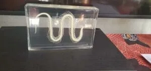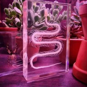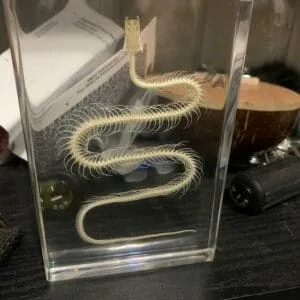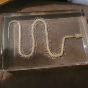 This snake skeleton in resin has been meticulously cleaned and whitened, allowing even the smallest of bones to be easily viewed and studied. It is encased in crystal clear resin allowing it to be viewed and from all angles. The nearly indestructible lucite makes it a wonderful teaching aid for years to come.