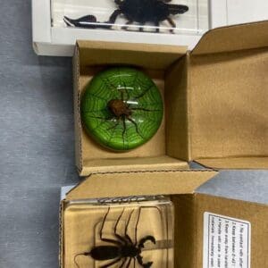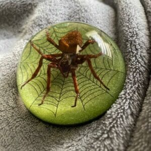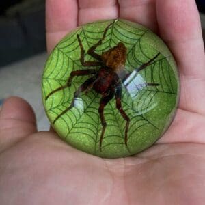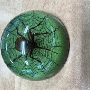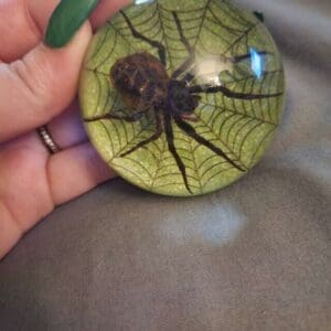 This real spider has been meticulously positioned within a solid, crystal clear resin dome. The bottom is a bright metallic green with a stylized spiderweb design. Items in this style are often referred to as a paperweight, but it makes a great addition to any spooky decor or oddities collection.