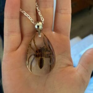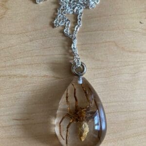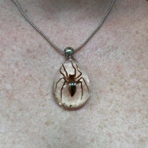 Embrace your love of nature with this Real Spider Pendant Necklace. This spider (Dolomedes Saganns) has meticulously has been set in a teardrop shaped, crystal clear resin pendant. The necklace chain is a lovely bright silver tone, with length options of 18 or 24 inches. Your purchase will come with a nice organza jewelry bag, ready to be given as a gift if you so choose.