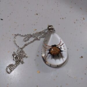 Make a statement and embrace your love of nature with this Real Spider Pendant Necklace. This orb weaving spiny spider (Gasteracantha sauteri) has been meticulously positioned and set in a teardrop shaped, crystal clear resin pendant. The necklace chain is a lovely bright silver tone, with length options of 18 or 24 inches. Your purchase will come with a nice organza jewelry bag, ready to be given as a gift if you so choose.