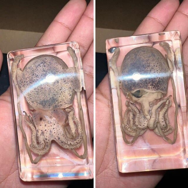 As with all specimens in lucite, size, color, and positioning of squid within the resin can vary slightly. Real Squid in resin Measures approx. 2 3/4 inches tall by 1 1/2 inches wide.