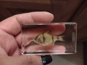 This cute little guys is a tiger barb fish in resin. Its scientific name is Puntius tetrazona. Also known as a Sumatra barb is a species of tropical fish originally found in Sumatra, Indonesia, Cambodia and Asia. This is a great aquatic specimen for teaching or to give as a gift.