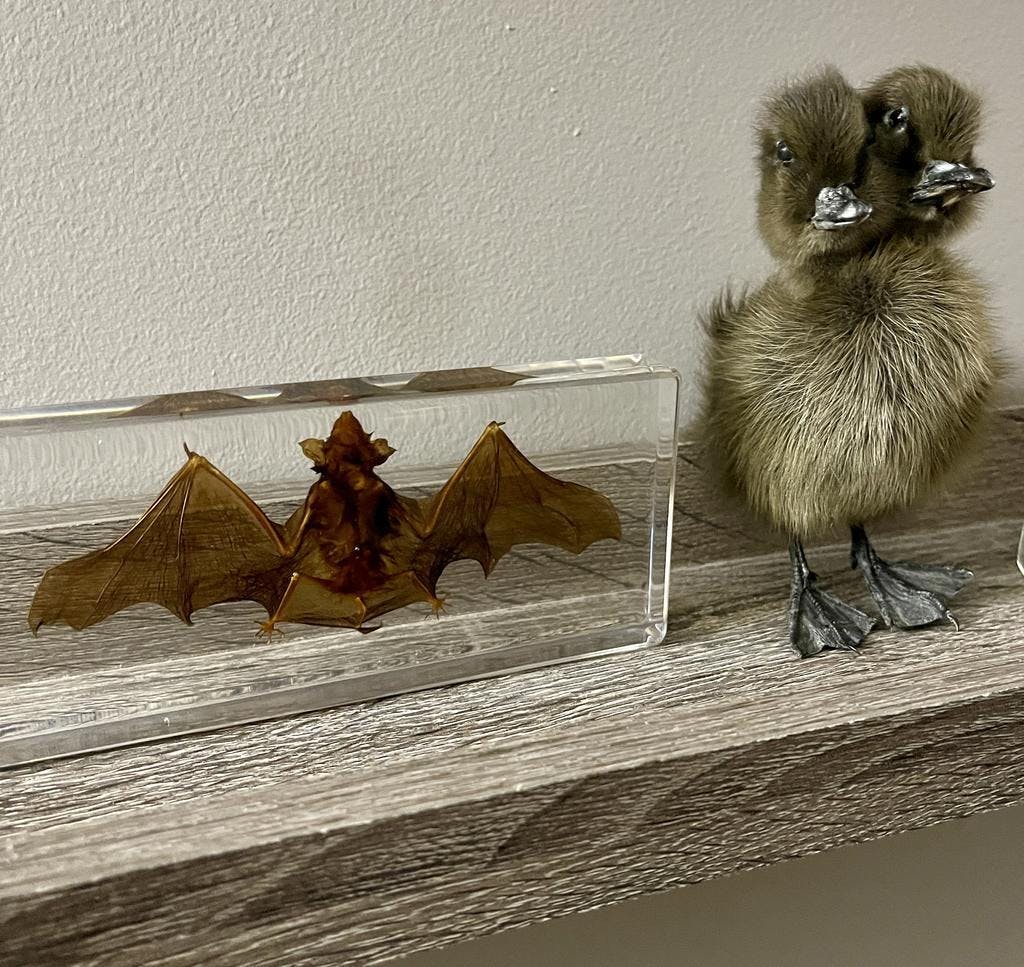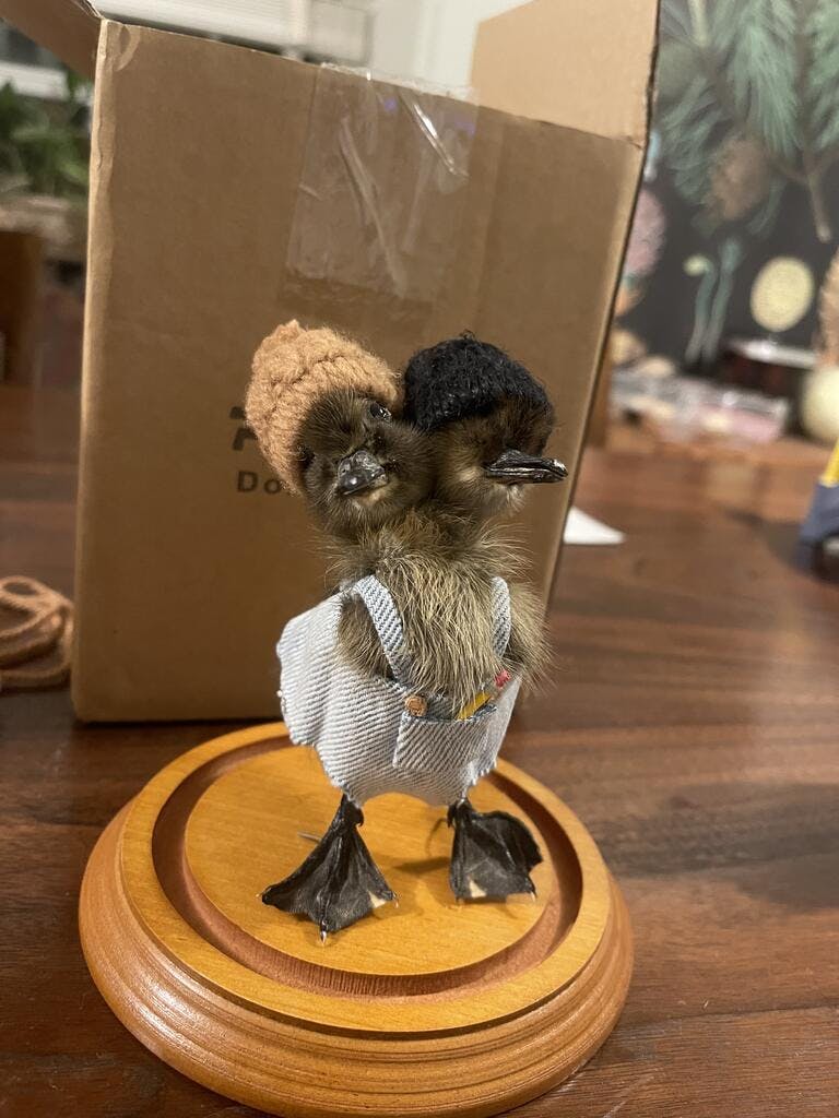 Behold! The 2 Headed Baby Duck! Although the ducklings are real, it is not born with two heads. This is a taxidermy gaff. This species of duck is known as the Domestic Duck. Its scientific name is Anas platyrhynchos domestica. This adorable little guy makes for an excellent gift, or add it to your oddities and curiosities collection as the worlds cutest shelf decoration.