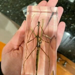 This insects main form of protection is the simple fact that it looks exactly like a stick. A stick has been placed within the resin block as an example of just how similar the two look. The females of the genus Phryganistria is classified as the world longest insect reaching lengths of 25 inches. This piece is definitely a wonderful science and teaching aid or unique specimen for any entomology collection.