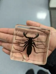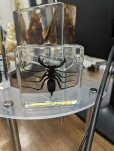 Encased in a clear resin, this specimen is an interesting addition to any arachnid or insect collection. All natural specimens in resin can vary slightly in size, positioning, and coloration. We guarantee a quality product.