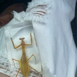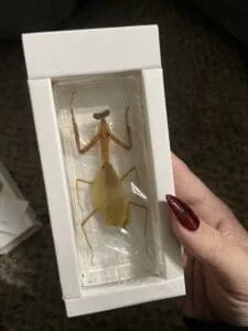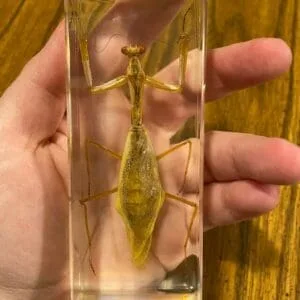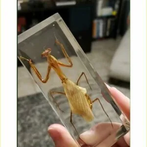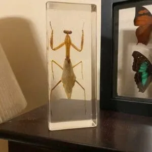 This real Praying Mantis in resin is an excellent teaching tool. Mantis are absolutely amazing with their triangular heads, bulging eyes and extremely flexible necks. You can see every detail of this interesting insect through the crystal clear resin.