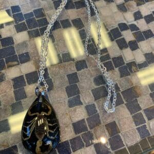 Embrace your love of nature with this Real Scorpion Pendant Necklace. This stunning Golden Scorpion has been set on a black background, teardrop shaped, resin pendant. The necklace chain is a lovely bright silver tone, with length options of 18 or 24 inches. Your purchase will come with a nice organza jewelry bag, ready to be given as a gift if you so choose.